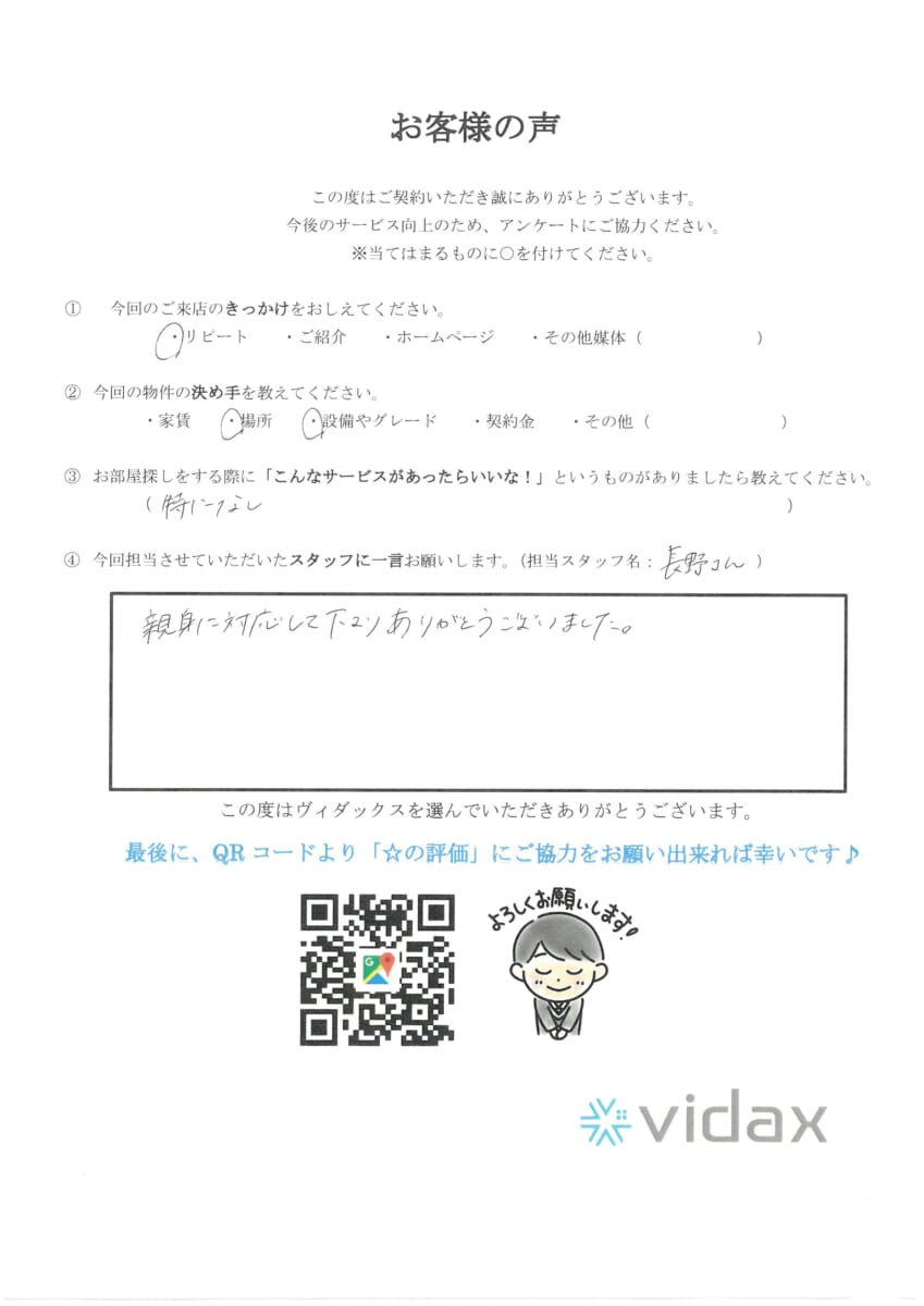 T・M様 丁寧にご対応くださり、ありがとうございました。また何かございました時は、今後ともよろしくお願いいたします。 担当者:五反田店 主任 石戸 数馬 この度は数ある不動産会社の中から弊社ヴィダックスを選んでいただき、誠にありがとうございま... -