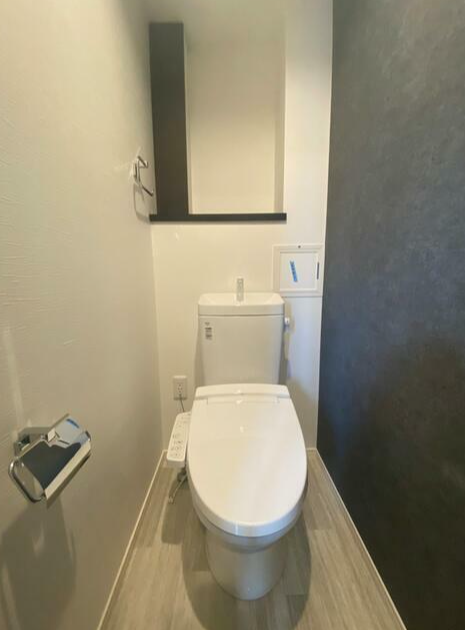 トイレは他の空間と完全に分かれており、清潔感のある手洗いスペースも備えています。寒い日でも快適な温水洗浄便座を装備しており、毎日快適に使えます。上部の棚にはトイレットペーパーや小物を整理して置くことができ、使いやすさにも配慮されています。