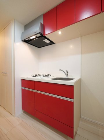 こちらのキッチンは、鮮やかなレッドカラーがアクセントになったスタイリッシュなデザインが魅力的です。