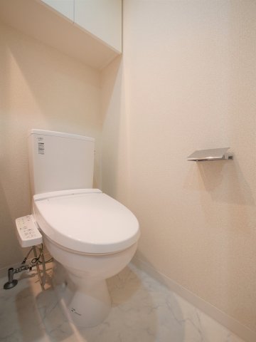 トイレは、圧迫感のない明るい空間にまとまっており、温水洗浄便座付きで日常的にも快適にお使いいただけます。上部には収納棚が設けられているため、トイレットペーパーや掃除用品などもすっきりと片付きます。