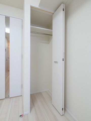 ゆとりあるクローゼット。ハンガーパイプ付きで、コートやワンピースなど丈の長い衣類もそのまま掛けて収納できます。上部の棚には、シーズンオフの洋服や寝具を置くのにも最適。シンプルながらも使いやすい、嬉しい収納スペースです。
