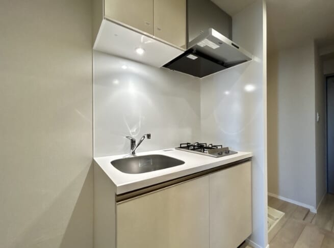 キッチンは一人暮らしに使いやすいコンパクトサイズながら、2口ガスコンロを備えた本格的な仕様。自炊派の方でもしっかりと料理が楽しめる設備が整っています。上下に収納スペースがあり、調理器具や食器もすっきり整理できるのが嬉しいポイント。システムキッチンの為、毎日のキッチン時間を快適にサポートしてくれます。都市ガスの為、お料理をよくされる方でもランニングコストを抑えられます。清潔感のあるデザインで、はじめての一人暮らしにも安心のキッチンスペースです。