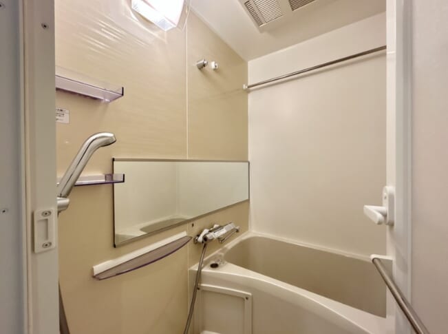 バスルームも白を基調とした清潔感あふれる空間で、ゆったりとリラックスできるつくりになっています。浴槽はしっかり足を伸ばせるサイズ感があり、一日の疲れをしっかり癒せるのが魅力。洗面室と分かれた独立タイプなので、湿気がこもりにくく、身支度のしやすさもポイントです。浴室乾燥も付いていますので、室内干しをされる方には嬉しいポイントです。