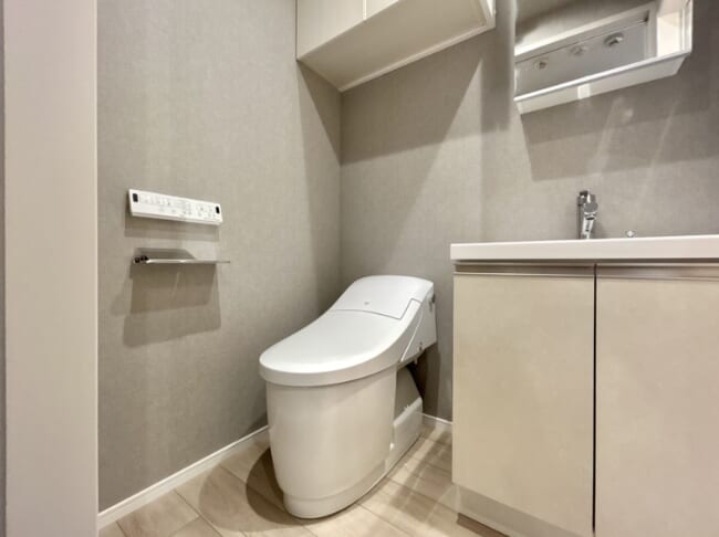 トイレは独立洗面台も併設したアメリカンセパレートタイプ。白基調の明るい内装で、毎日気持ちよく使える雰囲気になっています。温水洗浄便座付きで機能面も充実しており、季節を問わず快適。上部に収納もあり、トイレットペーパーや小物類をすっきりまとめられるのも嬉しいポイントです。無駄のないレイアウトで、一人暮らしにぴったりの使い心地の良いトイレ空間となっています。