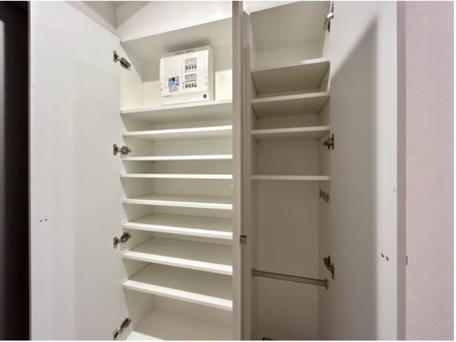 単身の方には十分すぎる広さのシューズボックスです。右部には別途収納がある為、傘やスーツケースなど居室に持ち込みにくい物も収納できるのがポイント。高さ調整も可能で高さのあるブーツや長靴はもちろん、臨機応変の収納として利用出来ます。