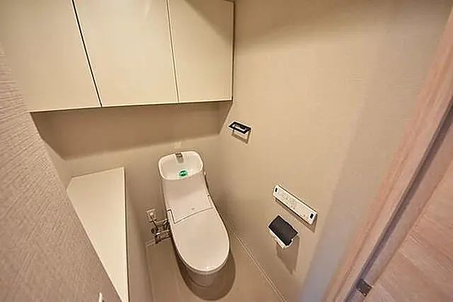 トイレは他の空間と完全に分かれており、清潔感のある手洗いスペースも備えています。寒い日でも快適な温水洗浄便座を装備しており、毎日快適に使えます。上部の棚にはトイレットペーパーや小物を整理して置くことができ、使いやすさにも配慮されています。