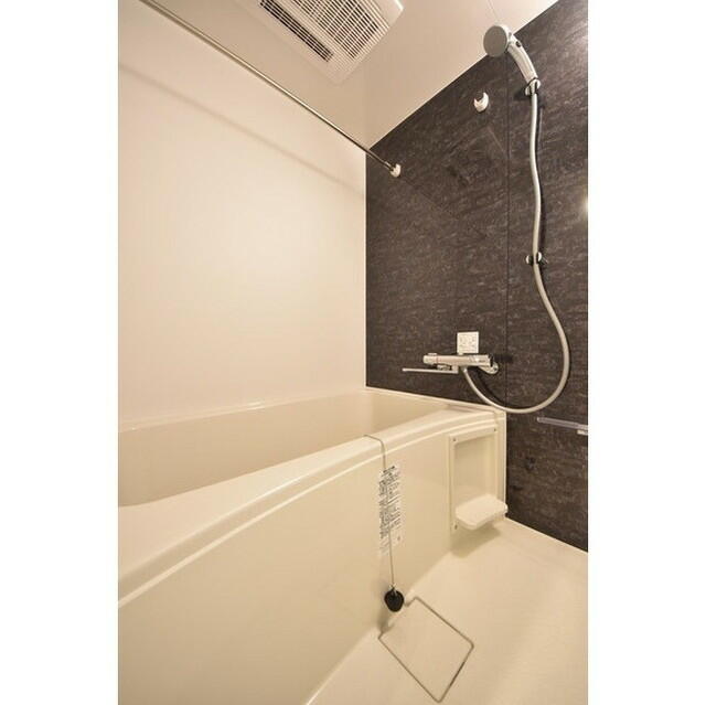 バスルームもモノトーンな空間で、ゆったりとリラックスできるつくりになっています。浴槽はしっかり足を伸ばせるサイズ感があり、一日の疲れをしっかり癒せるのが魅力。洗面室と分かれた独立タイプなので、湿気がこもりにくく、身支度のしやすさもポイントです。浴室乾燥も付いていますので、室内干しをされる方には嬉しいポイントです。