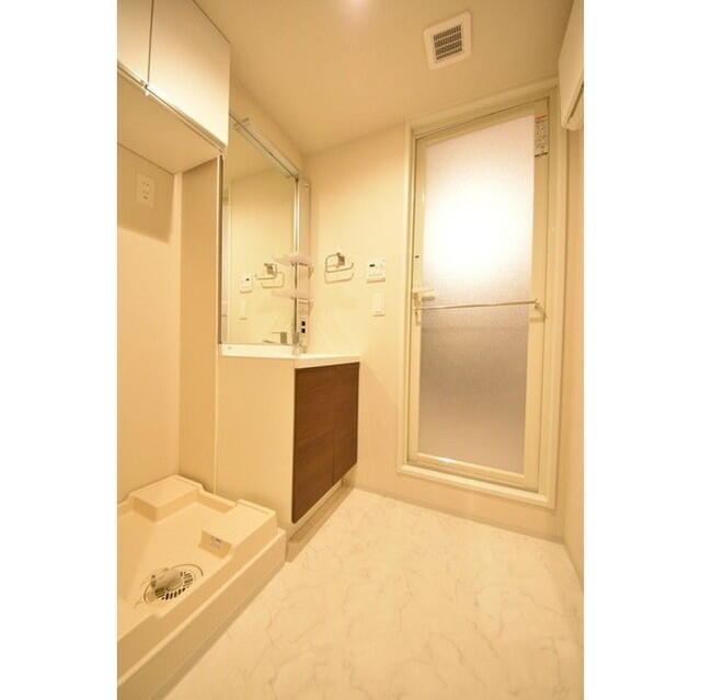 コンパクトながらも使い勝手を重視した設計になっています。バスルームとトイレが独立しているため、脱衣スペースとしてしっかりと確保されており、入浴前後の身支度をゆったりと行うことができます。内装は明るい色調で清潔感があり、毎日の生活に快適さを感じられる空間です。限られた面積の中でも機能性と快適性を両立させた、シンプルで整った脱衣所となっています。