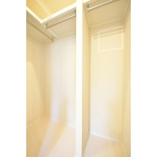 限られた空間の中でも効率的に整理整頓ができるよう工夫されています。洋室にはクローゼットが設けられており、衣類や日用品をすっきりと収納可能です。奥行きのある設計で、ハンガーパイプを利用すればコートやワンピースなどの丈の長い衣類もきれいに掛けられます。上部には棚も備わっており、季節物の収納や小物の整理にも便利です。全体的にシンプルで使いやすい構造となっており、一人暮らしに十分な収納力を確保しています。限られたスペースを有効活用し、生活空間をすっきりと保てる設計が魅力です。