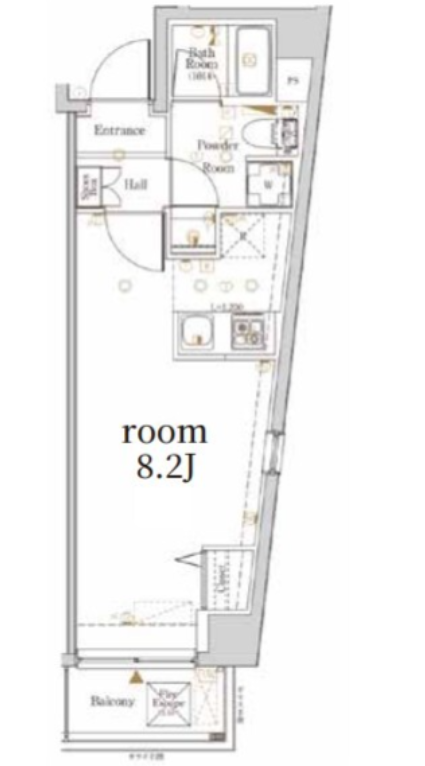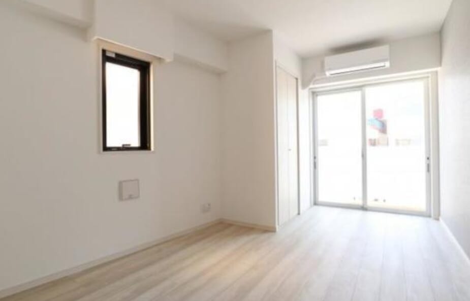 洋室は約8.2帖のゆとりあるワンルームタイプで、縦に長いスタイリッシュな間取りが特徴です。大きめの窓から光がしっかり入り、明るく開放感のある雰囲気に。家具の配置がしやすい形状のため、ベッド・ソファ・デスクなどもバランス良く置け、自分好みのレイアウトが楽しめます。