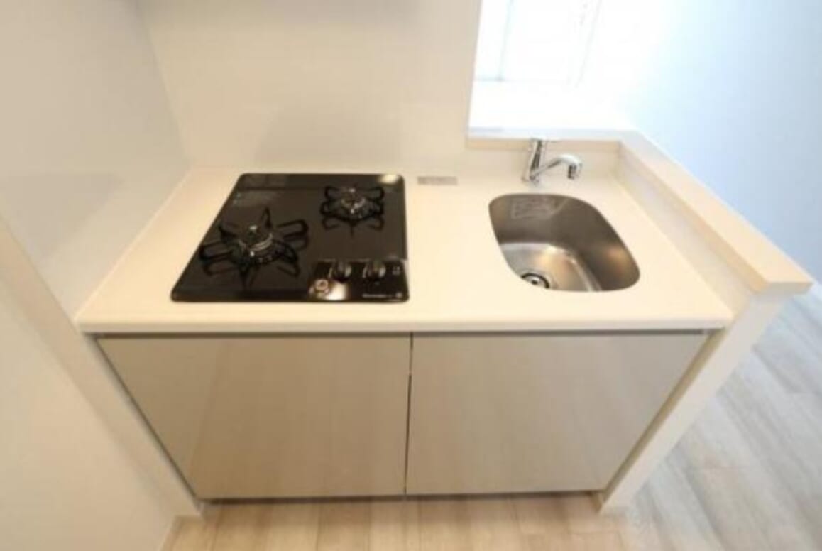 キッチンは2口ガスコンロを備えた使い勝手の良いシステムキッチン。コンパクトながら調理スペースがしっかり確保されており、自炊派の方でもストレスなく料理が楽しめる仕様です。収納には調理器具や食器を整理してしまえるため、生活感を抑えたスマートなキッチンづくりが可能。