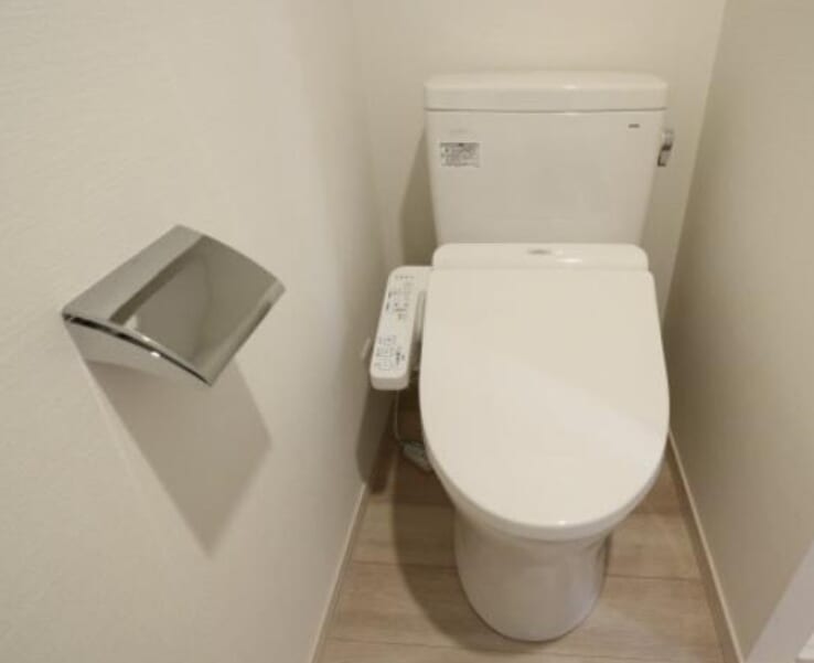 トイレはシンプルで清潔感のある明るい空間で、毎日気持ちよく使える仕様になっています。温水洗浄便座を完備しており、季節を問わず快適に利用できるのが嬉しいポイント。