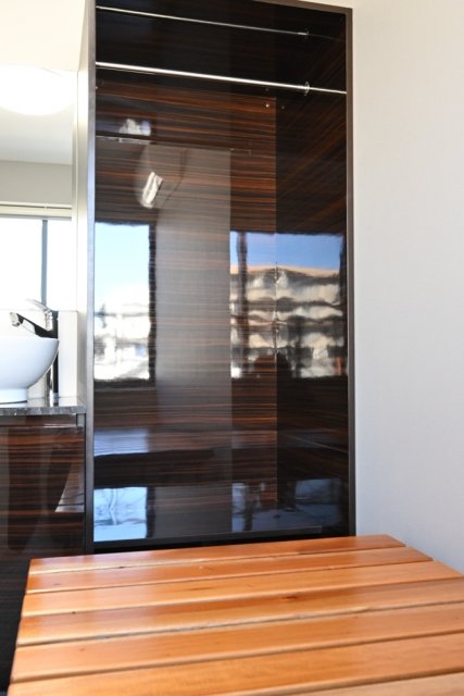 スマートなオープンクローゼット。どんなインテリアにも対応できるシックなデザインでおすすめポイントとなっております。