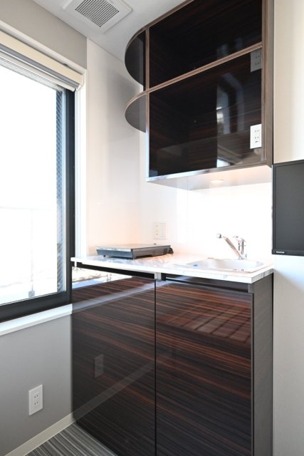 ダークウッド調の収納が美しいキッチンは、見た目も機能もスマート。