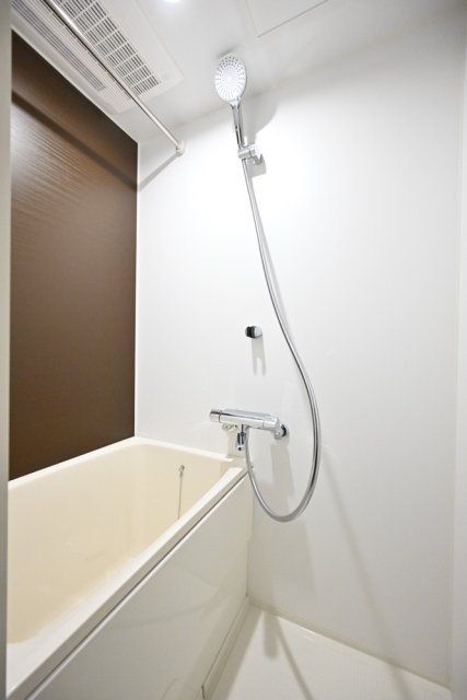 落ち着いたブラウンのアクセントパネルが、シンプルながらも上品な雰囲気を演出しています。ゆったり入れるバスタブと、使いやすいシャワーヘッドを備えた快適な設計。