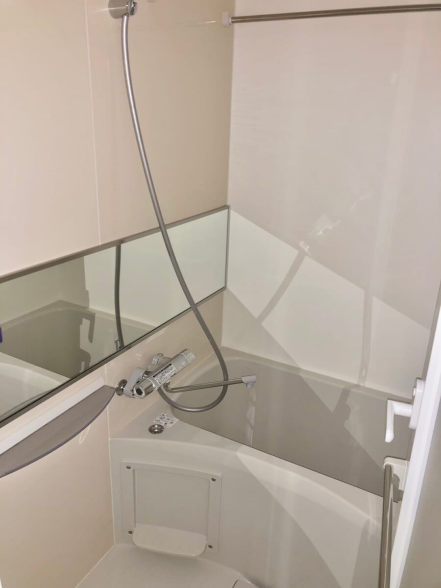 横長の大きな鏡がポイント。清潔感のあるデザインで毎日のバスタイムを優雅に過ごすことができます。また、浴室乾燥機も完備されており、急な雨でも洗濯物の心配は要りません。