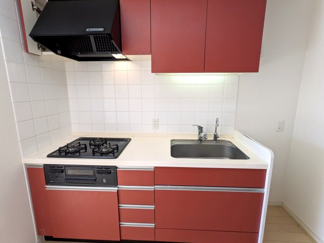 空間のアクセントになりつつ、清潔感のある白いタイルとの組み合わせで、明るくすっきりとした印象です。2口ガスコンロを備えており、自炊派の方にも嬉しい仕様。