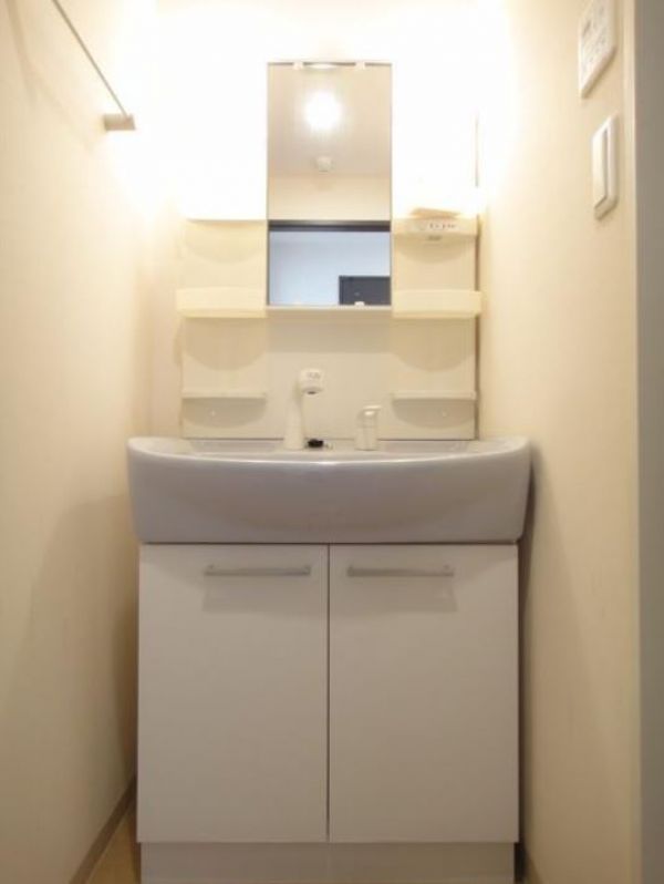 洗面台はシンプルで扱いやすく、鏡のサイドには十分すぎるライト付き。棚も豊富にあるため、化粧品や日用品をすっきり整理できます。洗濯機置き場もこのエリアにまとまっているため、家事動線がとても効率的。朝の忙しい時間帯でもスムーズに準備ができ、夜はゆっくりとリラックスモードに切り替えられる場所です。生活の質を左右する大切な空間として、整えがいがあります。