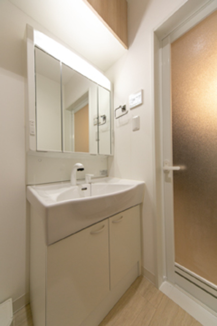 こちらの物件には、独立した洗面台が設置されています。