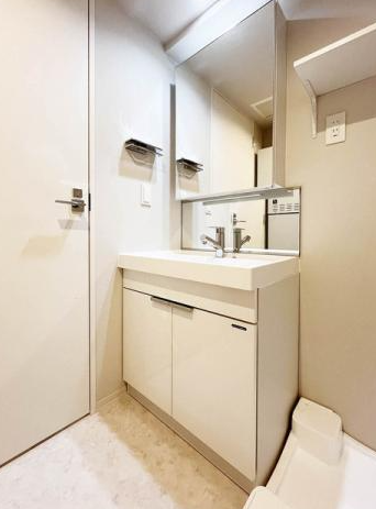 また、室内洗濯機置き場を備えているため、家事動線も良好。朝の身支度から入浴後のケアまで、毎日の生活を快適にサポートする、機能性と清潔感を兼ね備えた脱衣空間です。