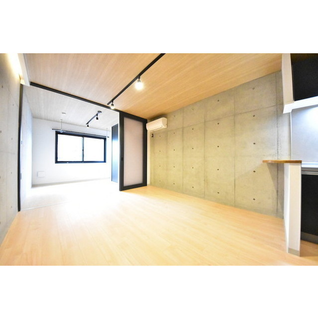 広いLDKは、白基調の木目調オフホワイトのフローリングとコンクリート打ちっぱなしの壁、マットブラックのメタル部材の調和でモダンでインダストリアルなすっきりとしたニューヨークを思わせる内装となります。スライドドアもシンプルに一面分まで収納ができ解放感のある広々とした居室空間が完成しております。