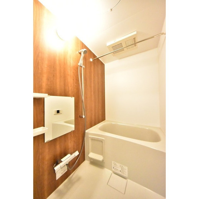 木素材を思わせる壁面が落ち着いた雰囲気を演出するしており、清潔感のあるバスルームとなります。シンプルながらも上品なデザインで、1日の疲れをゆっくり癒せる空間です。サイズのお一人で入る物としては十分な広さが確保されております。掃除のしやすい仕様なので、忙しい方でもきれいな状態を保ちやすいのも嬉しいポイントとなります。