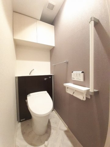 トイレは完全独立型で、スタイリッシュなデザインとなっております。便座には寒い日も快適な暖房便座付き温水シャワートイレを完備しており、一年中気持ちよく利用できます。上部には棚が設置され、トイレットペーパーなどのストックをすっきりと収納できます。