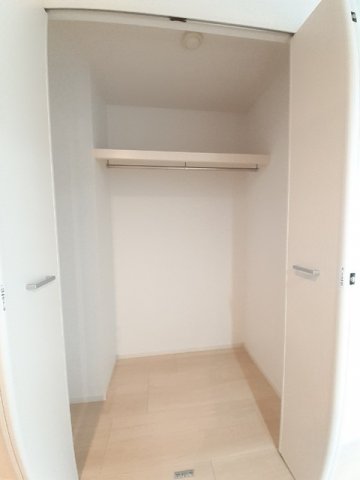 寝室だけではなくリビング側にもクローゼットがあり、2人分の収納が十分と確保されたクローゼット。奥行きがしっかりあり、ハンガーパイプ付きで洋服を効率よく収納できます。上部にも棚がついており、普段使いするものと保管をしておくもので分けて収納することができます。服好きの方にもおすすめできる仕様となっております。