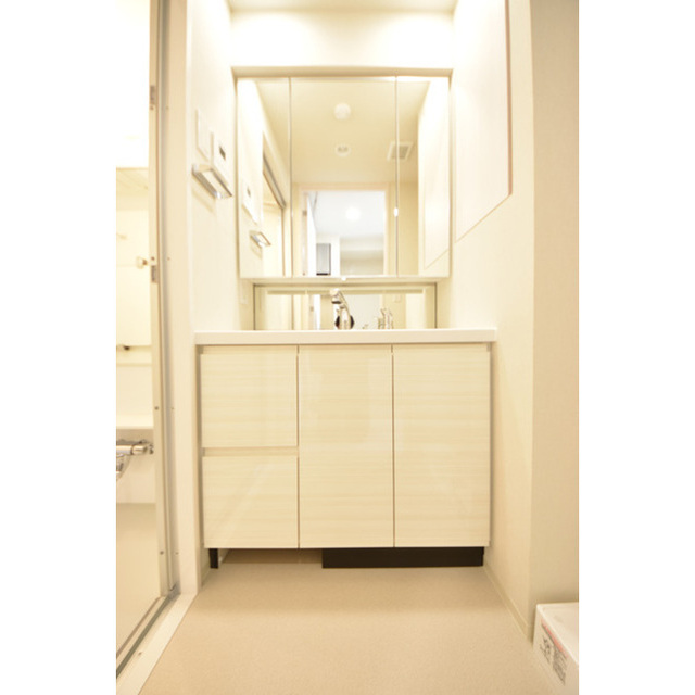 こちらの独立洗面台もキッチン同様に、白基調の空間に落ち着きのある木目調の配色でモダンな雰囲気にまとまっております。シンプルに配置された洗面台の上部には3面の鏡が設置され、その裏には収納スペースがございます。洗面台下部の収納と合わせると、脱衣所で必要となる物品は全て収納可能となります。