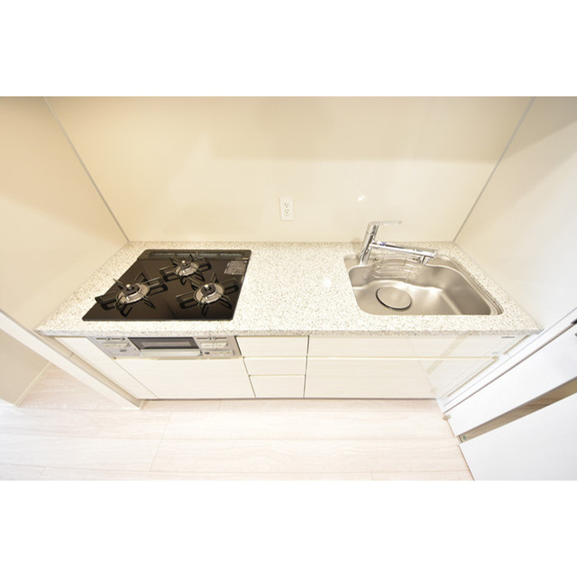 白基調のLDKの中に、石材を思わせる重厚な配色のシステムキッチンを採用。3口のガスコンロにグリルを完備し、広々としたシンクとお料理をされる方ならこれ以上ないクオリティではないでしょうか。コンロスペースとシンクの間には調理スペースも広く設けられております。収納についてもシンク上部とキッチン下部全面の配置となっており、調理道具や食器類、調味料やお掃除道具も問題収納可能となっております。