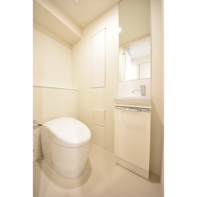 トイレは全て白での統一され、清潔感のある空間となっております。トイレ自体も最新式の設備が導入されており、独立した操作盤で簡単にコントロールが可能となっております。トイレ側部には棚が設置され、トイレットペーパー等の必要な物品の収納には事欠かない設計となっております。