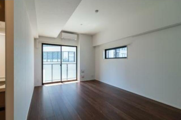 シックなダークブラウンのフローリングが、お部屋全体を落ち着いた都会的な印象に仕上げています。バルコニーへ繋がる大きな掃き出し窓だけでなく、壁の高い位置に横長のスリット窓が設けられているのがポイントです。これにより、外からの視線を遮りながらも光を取り込み、さらに効率的な換気が可能になっています。
