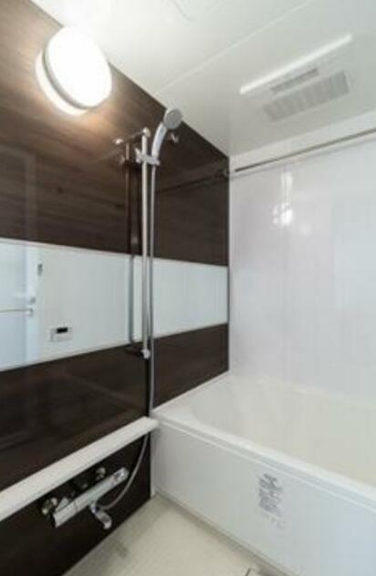 壁一面に使われた深みのある木目調アクセントパネルが、癒やしのバスタイムを贅沢に演出します。空間を広く見せるワイドミラーや、小物を置けるスリムなカウンターも完備されており、デザイナーズ物件らしい洗練された機能美が感じられます。