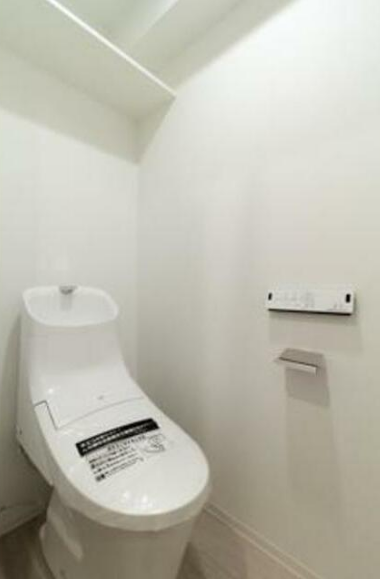 白を基調とした清潔感のある空間で、壁掛けリモコン付きのシャワートイレがスマートな印象を与えます。便器上部にはデッドスペースを活かした奥行きのある棚板が設置されており、ストック品を置くのに非常に便利です。