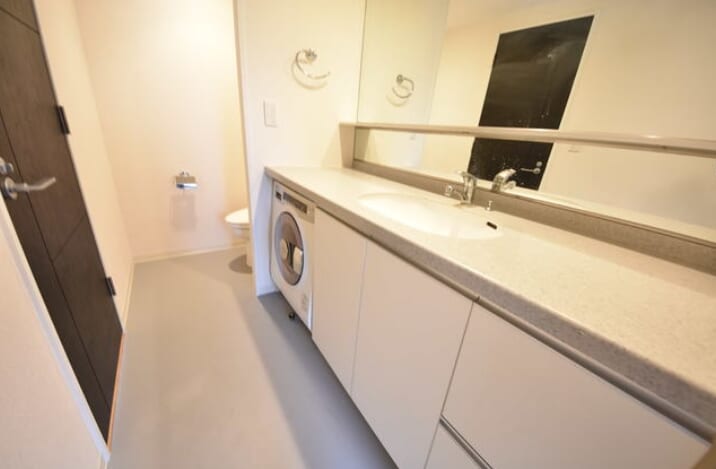 「パークアクシス渋谷桜丘ウエスト」のサニタリールームは、機能美とゆとりを追求した、朝の準備を優雅に演出する空間です。スタイリッシュな独立洗面台の傍らには、広々としたカウンタースペースを確保。身支度品を置いたり、忙しい合間の家事動線としても重宝する余裕の設計が魅力です。さらに、高性能な洗濯乾燥機を標準装備しており、洗面・脱衣から洗濯・乾燥までを一つの空間で完結。都会のスマートな暮らしを支える、機能性と利便性が凝縮されたプライベートエリアです。