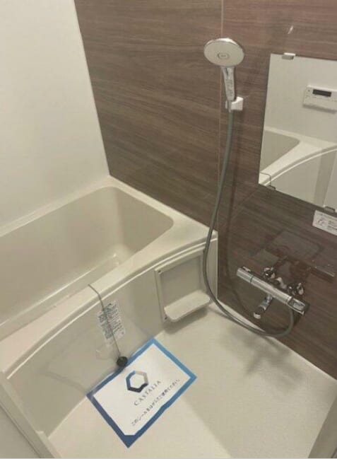 お風呂は、すべての画像で木目調のアクセントパネルが採用されており、落ち着きのあるモダンな癒やしの空間を演出しています。鏡、シャワー、小物を置ける棚も完備されています。特に、あるお部屋では壁面に横長のニッチ棚が埋め込まれており、デザイン性の高さと使い勝手の良さが両立されています。
