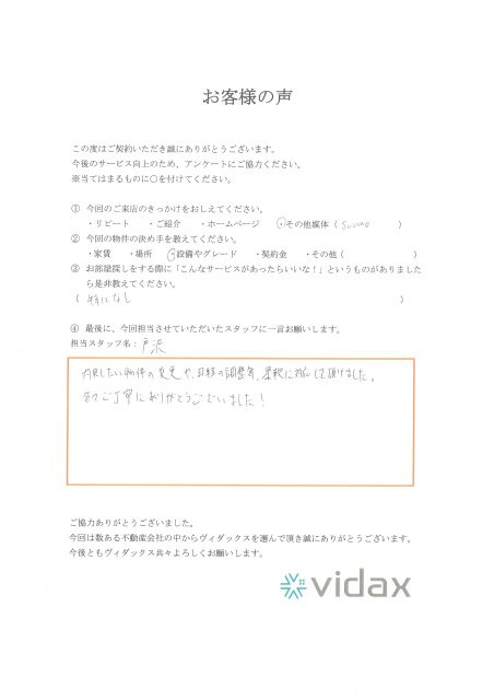 N・Y様 2025 11/18 お客様の声 2025年11月18日 N・Y様 内見したい物件の変更や、日程の調整等、柔軟に対応して頂けました。色々ご丁寧にありがとうございました! 担当者:五反田店 店長 戸沢 海渡 ご自身の納得がいくお部屋ご紹介出来て、何よりです!新生活頑張って下さい お客様の声 よかったらシェアしてね! URLをコピーしました! W・F様 M・R様/T・A様 この記事を書いた人 株式会社ヴィダックス 株式会社ヴィダックスの編集メンバーが不定期で更新します。不動産界隈の最新ニュース・物件更新情報・株式会社ヴィダックスからのお知らせやお部屋探しに役立つ情報をわかりやすく紹介します! 関連記事 T・T様 2025年11月19日 U・E様 2025年11月19日 H・H様 / H・A様 2025年11月19日 アーティスト:4s4ki様 2025年11月19日 N・K様 2025年11月19日 K・Y様 2025年11月19日 T・M様 2025年11月19日 K・C様 / K・Y様 2025年11月19日