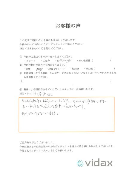 たくさんの物件を紹介していただき、その中で妥協せずに良い物件に出会えて本当に良かったです。