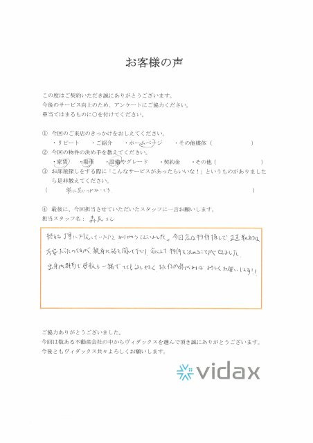 今回急な物件探しで正直最初は不安だったのですが、親身に話を聞いて下さり、安心して物件を決めることができました。