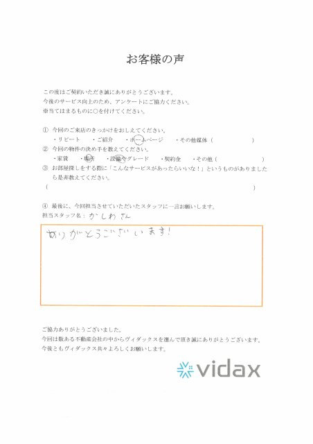 H・T様 2025 11/18 お客様の声 2025年11月18日 H・T様 ありがとうございます! 担当者:渋谷店 柏 侑衣 この度はご成約いただきありがとうございました!無事に最高の物件に巡り合えてよかったです^^新生活楽しんでください!また何かあればご連絡お待ちしております! お客様の声 よかったらシェアしてね! URLをコピーしました! R・T様 U・Y様 この記事を書いた人 株式会社ヴィダックス 株式会社ヴィダックスの編集メンバーが不定期で更新します。不動産界隈の最新ニュース・物件更新情報・株式会社ヴィダックスからのお知らせやお部屋探しに役立つ情報をわかりやすく紹介します! 関連記事 T・T様 2025年11月19日 U・E様 2025年11月19日 H・H様 / H・A様 2025年11月19日 アーティスト:4s4ki様 2025年11月19日 N・K様 2025年11月19日 K・Y様 2025年11月19日 T・M様 2025年11月19日 K・C様 / K・Y様 2025年11月19日