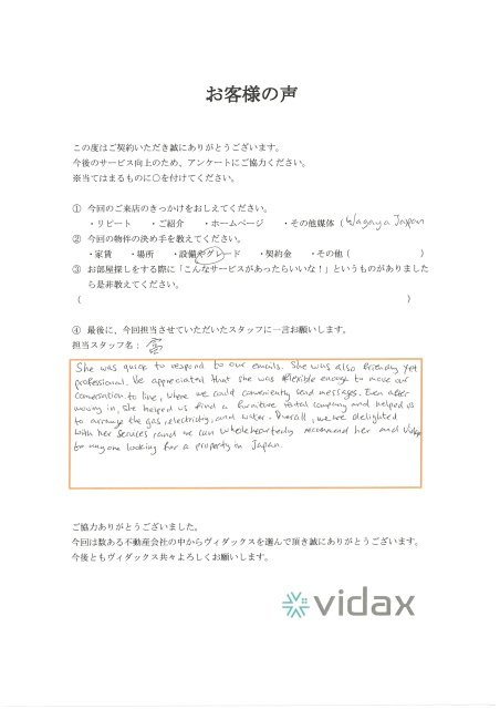 Aika was quick to respond to our emails. She was also friendly yet professional. We appreciated that she was flexible enough to move our conversation to line, where we could conveniently send messages. Even after moving in, she helped us find a furniture rental company and helped us to arrange the gas, electricity and water. Overall, we are delighted with her services and we can wholeheartedly recommend her and Vidax to anyone looking for a property in Japan.