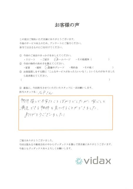 物件探しで不安なことばかりでしたが、安心して満足できる物件を見つけることができました。ありがとうございました!