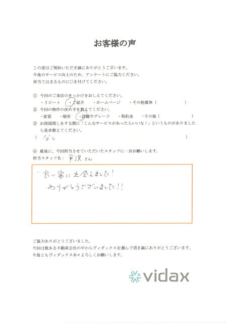 T・T様/Y・R様 2025 11/18 お客様の声 2025年11月18日 T・T様/Y・R様 良い家に出会えました!ありがとうございました!! 担当者:五反田店 店長 戸沢 海渡 良い物件をご紹介出来て幸いです!またお引っ越しの際はご連絡下さいませ! お客様の声 よかったらシェアしてね! URLをコピーしました! S・Y様 ★提携企業従業員様★様 この記事を書いた人 株式会社ヴィダックス 株式会社ヴィダックスの編集メンバーが不定期で更新します。不動産界隈の最新ニュース・物件更新情報・株式会社ヴィダックスからのお知らせやお部屋探しに役立つ情報をわかりやすく紹介します! 関連記事 H・M様 2025年11月22日 T・T様 2025年11月19日 U・E様 2025年11月19日 H・H様 / H・A様 2025年11月19日 アーティスト:4s4ki様 2025年11月19日 N・K様 2025年11月19日 K・Y様 2025年11月19日 T・M様 2025年11月19日