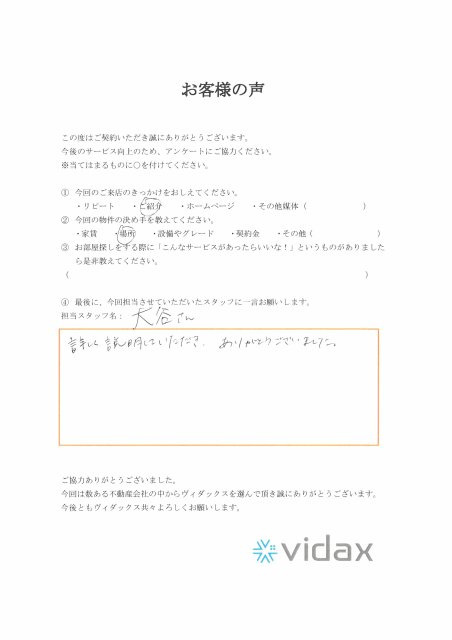 T・H様 2025 11/18 お客様の声 2025年11月18日 T・H様 ありがとうございます! 担当者:渋谷店 主任 大谷 悠輔 こちらこそありがとうございました。お引越しを機にお仕事より一層頑張ってください!タイミング合えば舞台等行かせていただきます! お客様の声 よかったらシェアしてね! URLをコピーしました! T・M様 K・M様 この記事を書いた人 株式会社ヴィダックス 株式会社ヴィダックスの編集メンバーが不定期で更新します。不動産界隈の最新ニュース・物件更新情報・株式会社ヴィダックスからのお知らせやお部屋探しに役立つ情報をわかりやすく紹介します! 関連記事 T・T様 2025年11月19日 U・E様 2025年11月19日 H・H様 / H・A様 2025年11月19日 アーティスト:4s4ki様 2025年11月19日 N・K様 2025年11月19日 K・Y様 2025年11月19日 T・M様 2025年11月19日 K・C様 / K・Y様 2025年11月19日