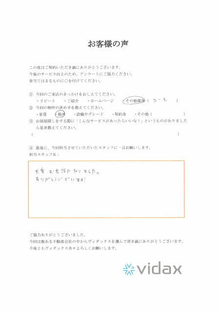 K・M様 2025 11/18 お客様の声 2025年11月18日 K・M様 大変お世話になりました。ありがとうございます! 担当者:渋谷店 主任 大谷 悠輔 こちらこそありがとうございました!気に入って頂いた物件で無事お決まりになられて安心しました!次回のお引越しの際も是非お任せください! お客様の声 よかったらシェアしてね! URLをコピーしました! T・H様 M・T様 この記事を書いた人 株式会社ヴィダックス 株式会社ヴィダックスの編集メンバーが不定期で更新します。不動産界隈の最新ニュース・物件更新情報・株式会社ヴィダックスからのお知らせやお部屋探しに役立つ情報をわかりやすく紹介します! 関連記事 T・T様 2025年11月19日 U・E様 2025年11月19日 H・H様 / H・A様 2025年11月19日 アーティスト:4s4ki様 2025年11月19日 N・K様 2025年11月19日 K・Y様 2025年11月19日 T・M様 2025年11月19日 K・C様 / K・Y様 2025年11月19日