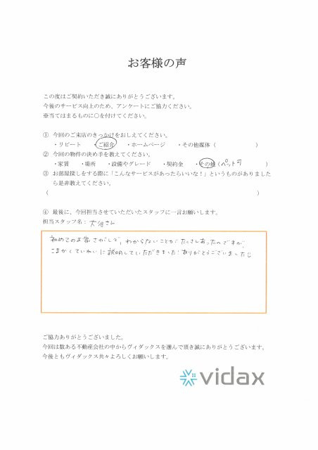 初めてのお家さがしで、わからないことがたくさんあったのですが、こまかくていねいに説明したいただきました!ありがとうございました!