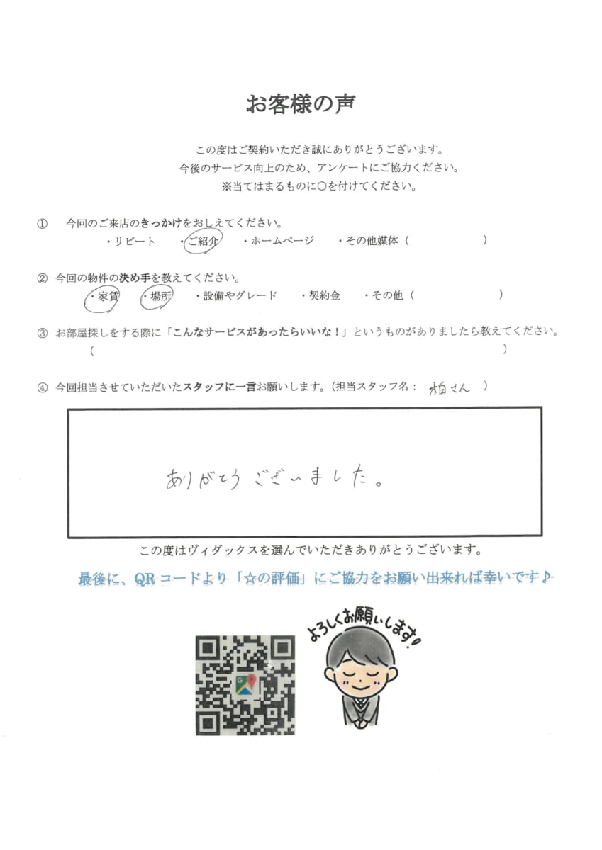 N・K様 2025 11/19 お客様の声 2025年11月19日 N・K様 ありがとうございました。 担当者:渋谷店 柏 侑衣 この度はご契約ありがとうございました!新社会人に向けて良いスタートになりそうですね^^また何かありましたらご連絡お待ちしております! お客様の声 よかったらシェアしてね! URLをコピーしました! T・Y様 J・C様 この記事を書いた人 株式会社ヴィダックス 株式会社ヴィダックスの編集メンバーが不定期で更新します。不動産界隈の最新ニュース・物件更新情報・株式会社ヴィダックスからのお知らせやお部屋探しに役立つ情報をわかりやすく紹介します! 関連記事 T・T様 2025年11月19日 U・E様 2025年11月19日 H・H様 / H・A様 2025年11月19日 アーティスト:4s4ki様 2025年11月19日 N・K様 2025年11月19日 K・Y様 2025年11月19日 T・M様 2025年11月19日 K・C様 / K・Y様 2025年11月19日