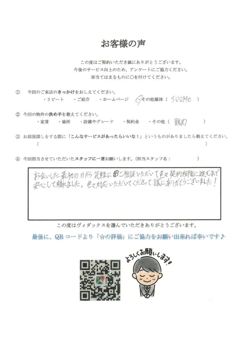 お会いした最初の日から気軽にご相談いただいて色々契約段階に進むまで安心して頼れました。