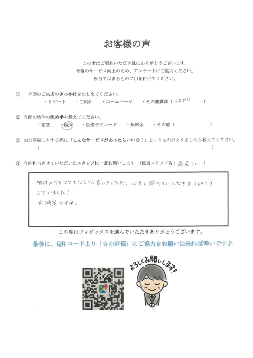 物件のワガママをたくさん言いましたが、快く調べていただきありがとうございました!