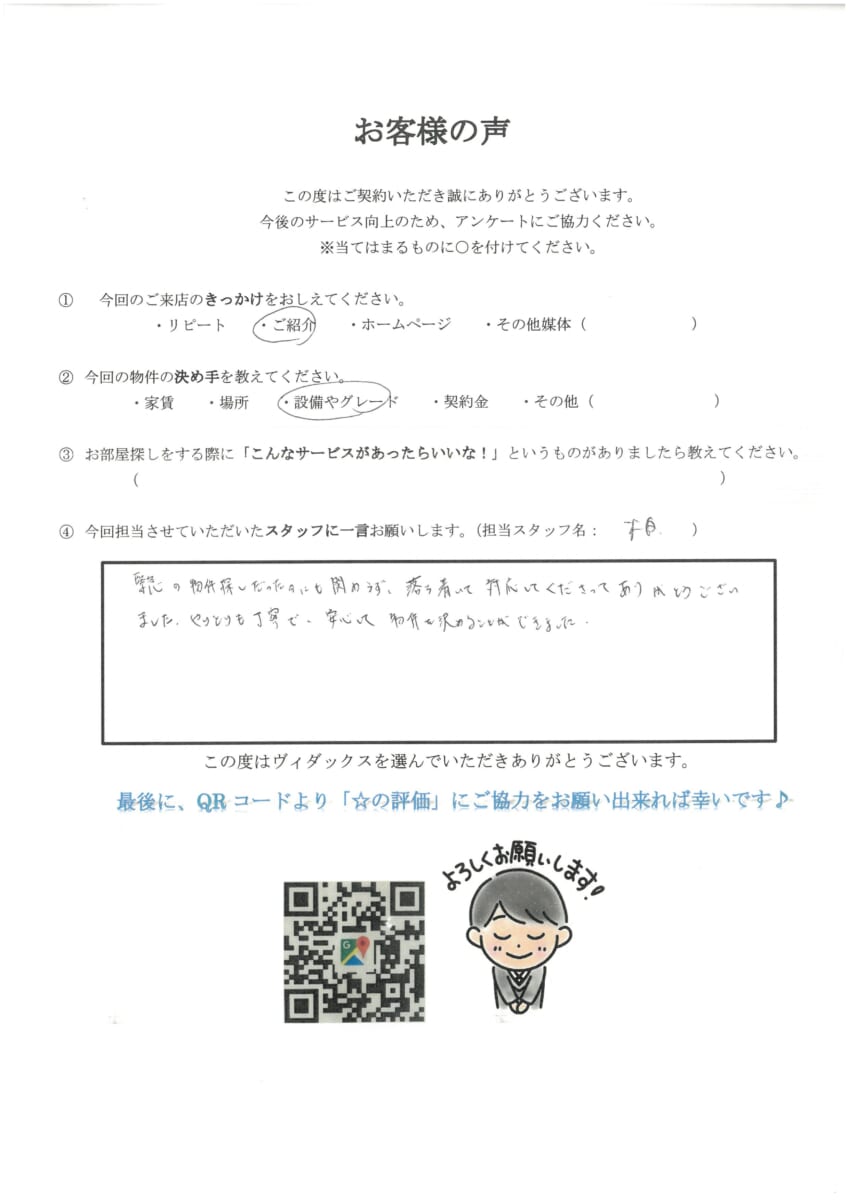 緊急の物件探しだったにも関わらず、落ち着いて対応してくださりありがとうございました。